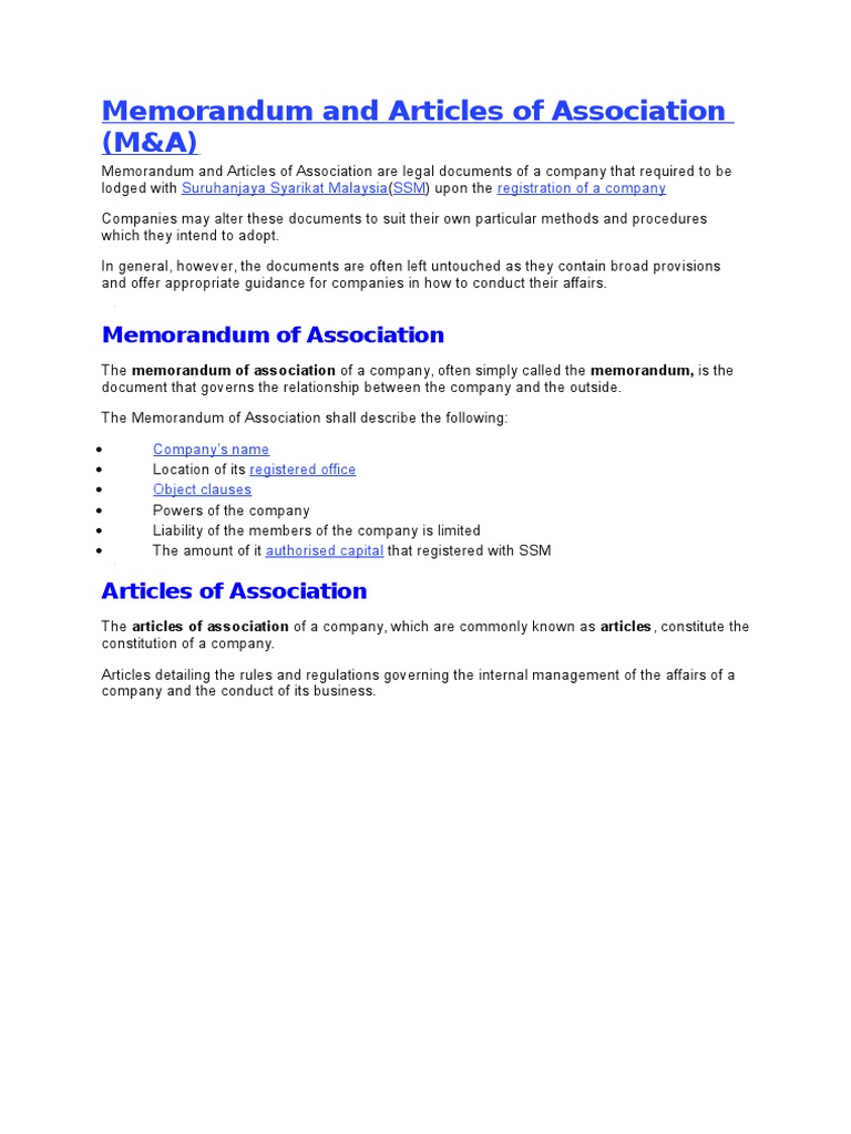 Memorandum and articles of association memorandum and articles of association memorandum of association of a company is the basic constitutional document that governs the relationship between a company and the outside world. Articles of association contain the rules and regulations which are to be followed for the internal management of the company based on the table c = it contains model form of memorandum and articles of association of a company limited by guarantee and not having a share capital The articles of association is a governing document that outlines the purpose of the company, the rights and responsibilities do i have to provide my own memorandum and articles of association? Article of association 1. It operates more than 230 retail stores in hong kong and macau sars, mainland china and malaysia.